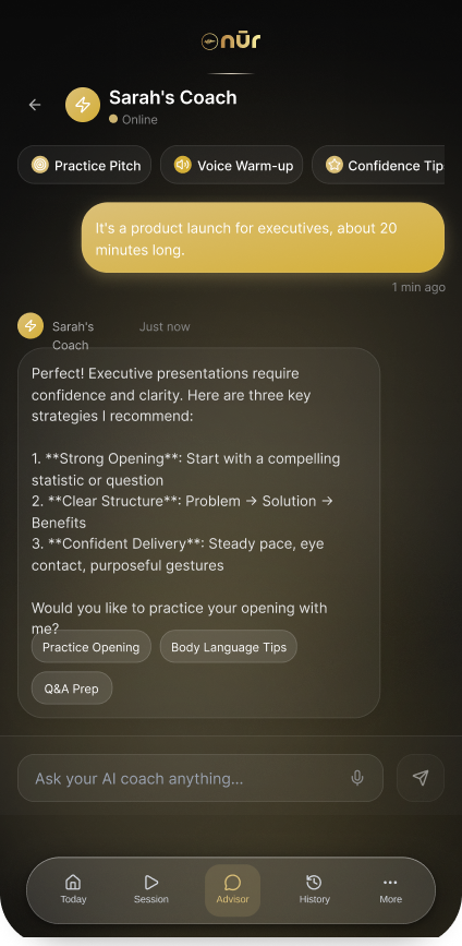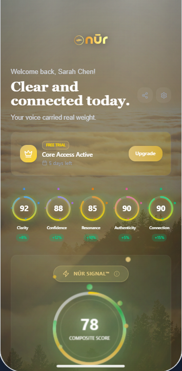 Tone shapes trust. Nur.Ai measures tonal patterns in your voice and provides insight into how they shift across situations. With greater awareness, you can adjust tone deliberately and maintain presence without forcing performance.
