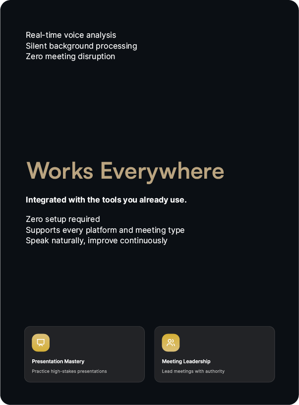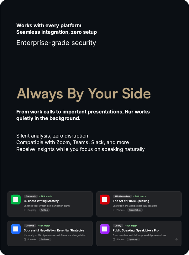 Your voice changes with environment and audience. Nur.Ai recognizes these shifts and helps you adapt while staying authentic. Whether the setting is professional or personal, your voice remains aligned with the moment.
